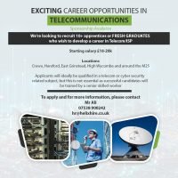 Candidates will be based in different locations around England, especially in Crewe, Hereford, East Grinstead, High Wycombe and around the M25. They will consider GSCE or graduates, ideally in a telecom or cyber security related subject but this is not essential as successful candidates will be trained by a senior skilled worker. What is more important is that the candidate have a desire to embark on a career in telecommunications.